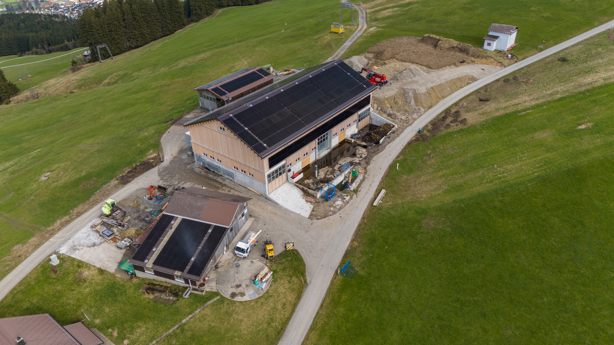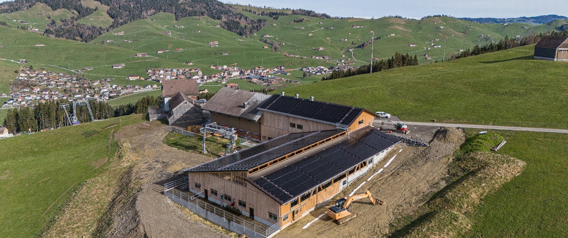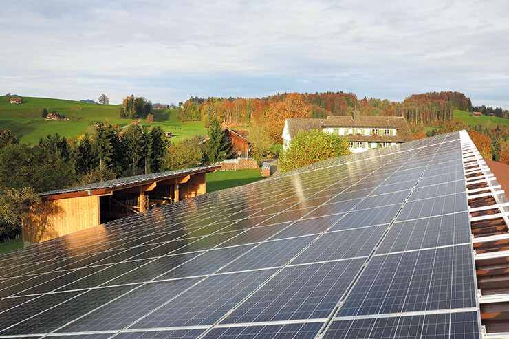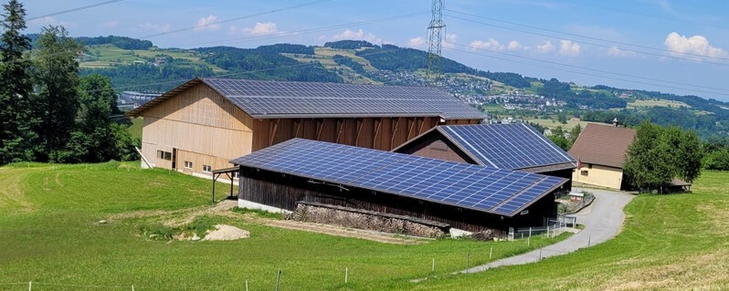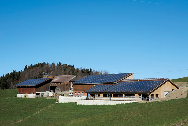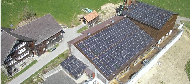 Auf der bestehenden Scheune, dem neuen Laufstall und dem Kälberunterstand des Bauernbetriebes der Familie Neff in Gais ist eine Photovoltaikanlage mit polykristallinen Panels installiert.