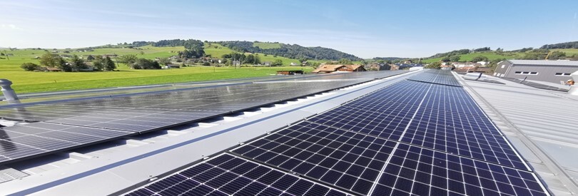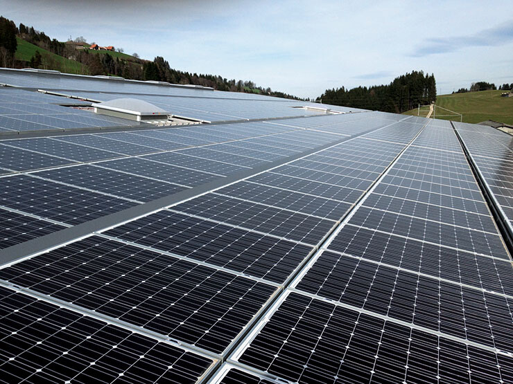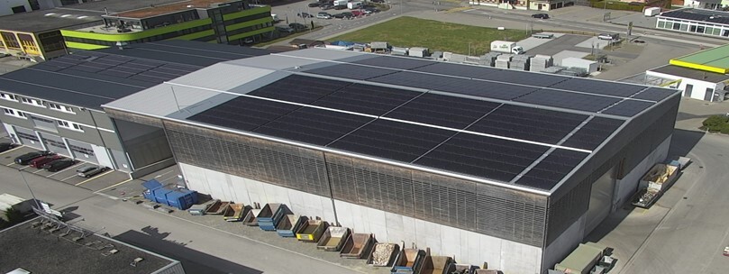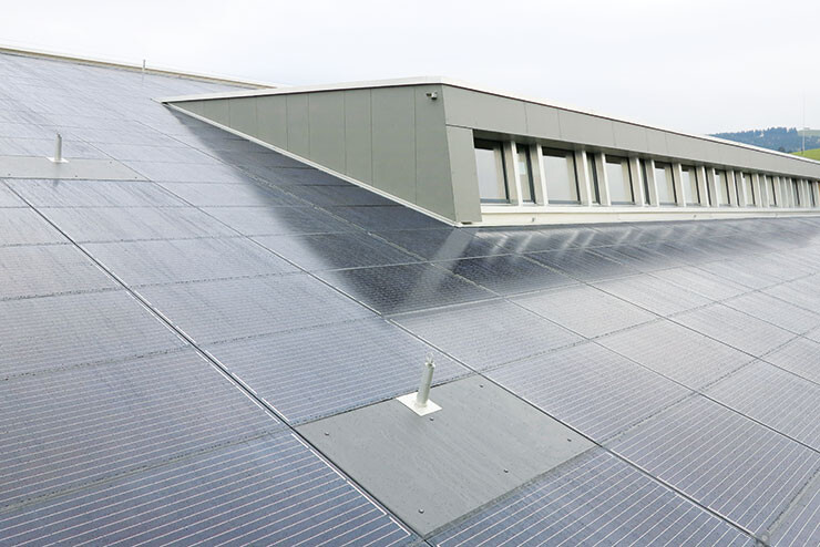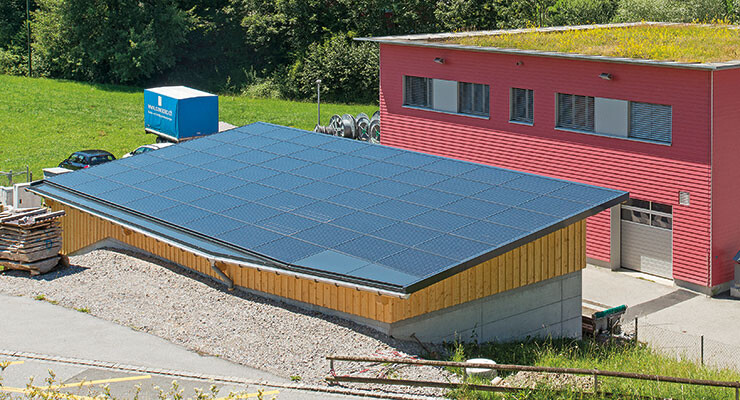 Auf den beiden Produktionshallen der Abderhalden Holzbau AG in Wattwil ist eine Photovoltaikanlage mit monokristallinen Panels installiert.