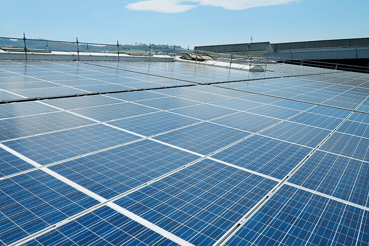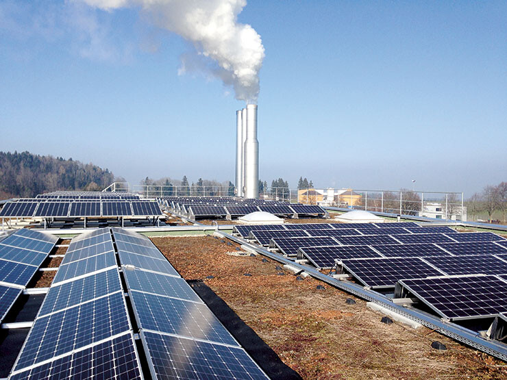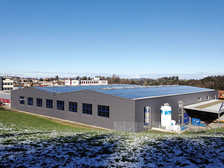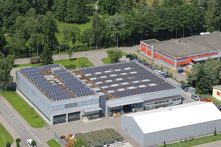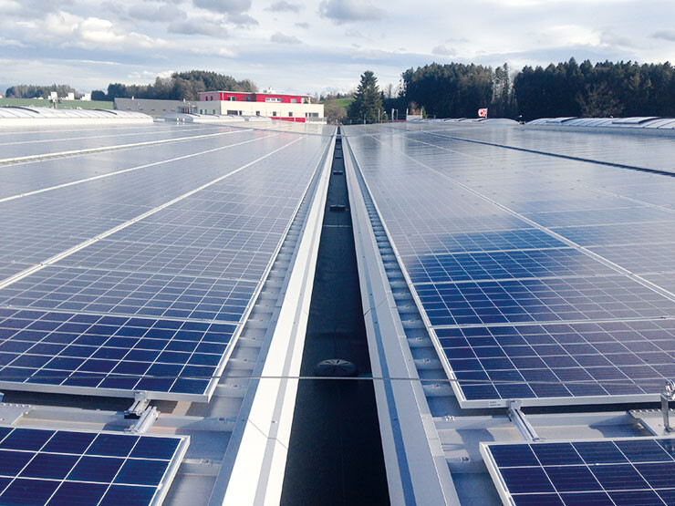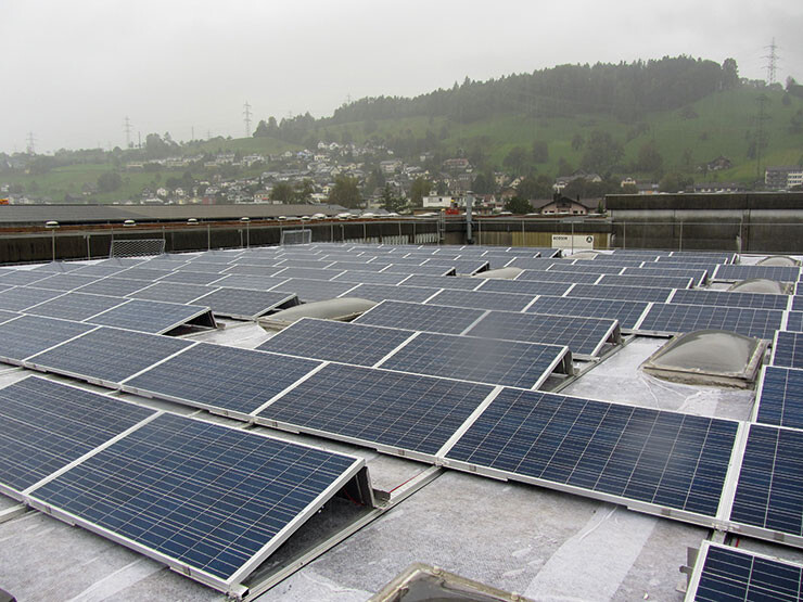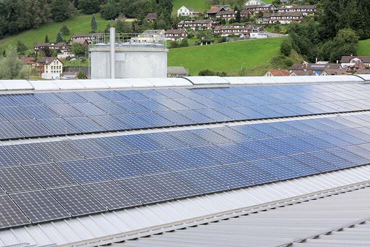 Auf den beiden Industriehallen und der Dieseltank- stelle der Johann Müller AG in Schmerikon ist eine Photovoltaikanlage mit polykristallinen Panels installiert.