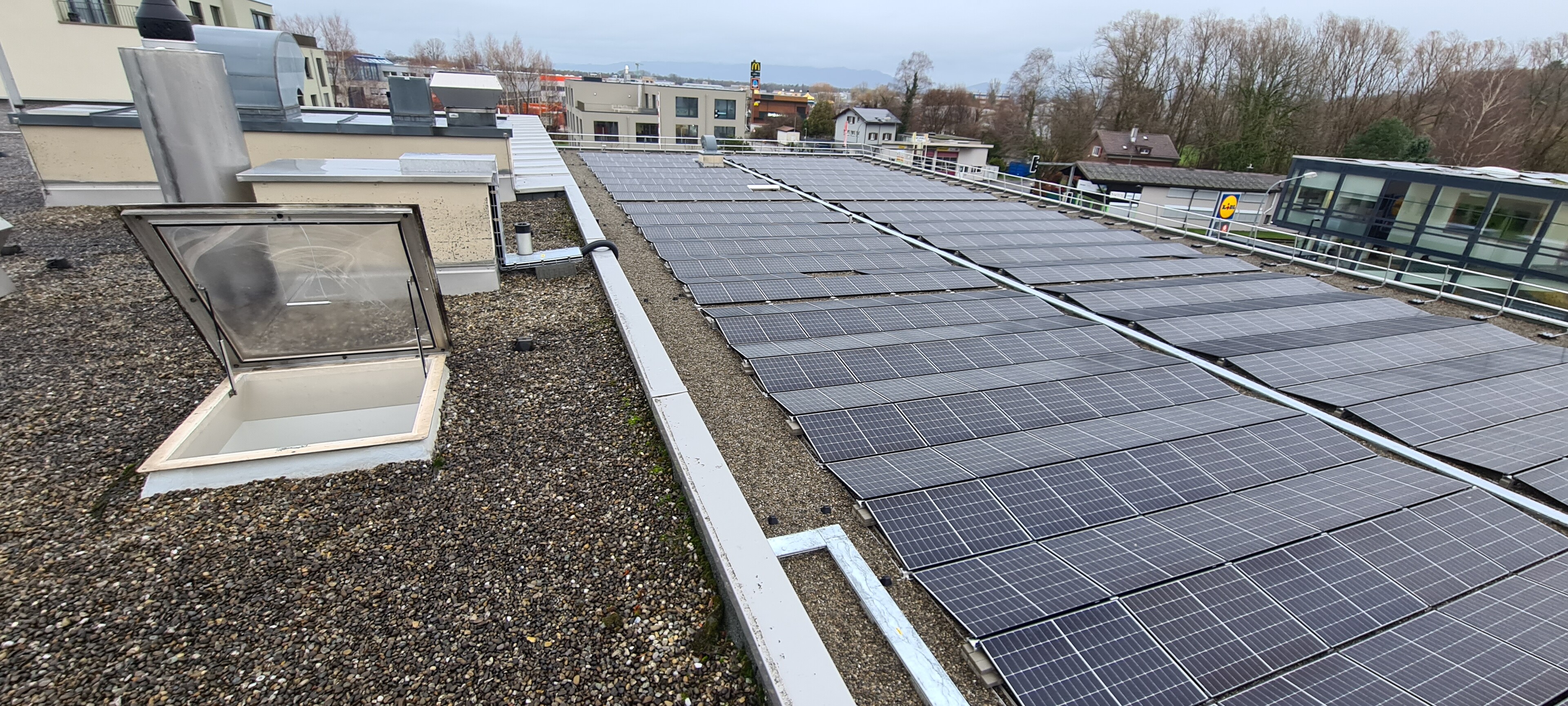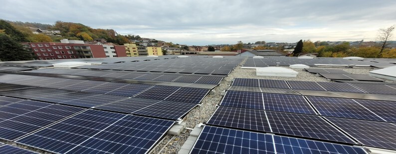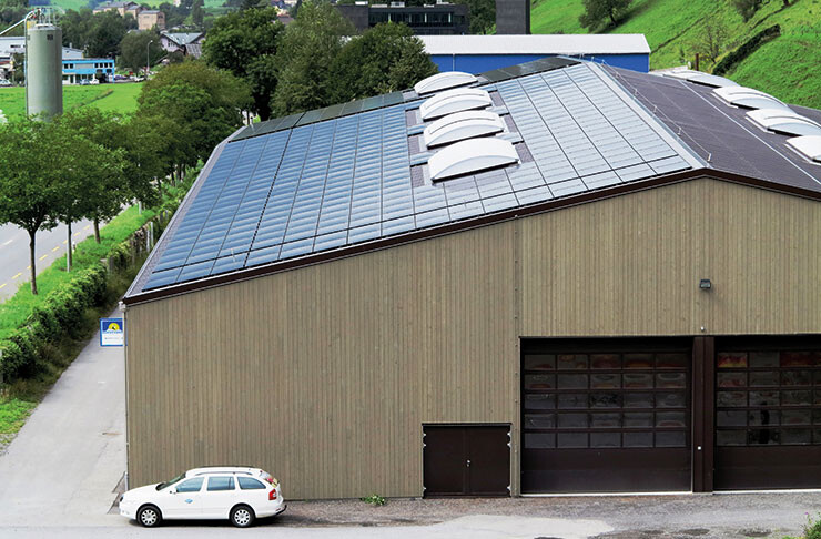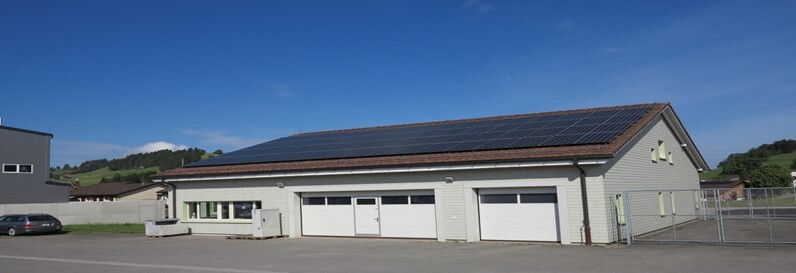 Durch den Einsatz eines innovativen Schweizer Montagesystems konnte das eher flach geneigte Dach wasserdicht mit Modulen bestückt werden. Bei den installierten Modulen handelt es sich um hochbelastbare Glas-Glas-Module, die komplett lichtdurchlässig sind. Dies führt am Tag zu einer sehr angenehmen natürlichen Beleuchtung in der Halle. Energiekosten durch Minimierung der Brenndauer der Beleuchtung werden damit eingespart und die Einstellhalle ist tagsüber gleichmässig ausgeleuchtet. Die Eigenverbrauchsquote beträgt rund 45%.