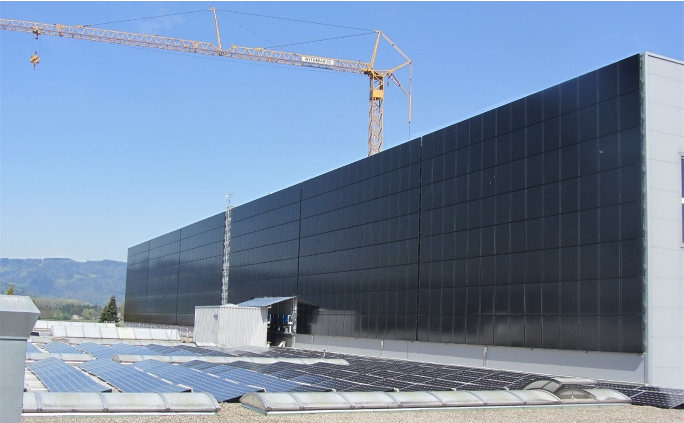 Auf dem Flachdach und an der Fassade ist eine PV-Anlage installiert. Diejenigen auf der Fassade (CIS) sind auf einem verstärkten Kreuzrost montiert. Durch die um 15 cm vorgehängte Fassade wird die direkte Wärmeeinstrahlung auf das Hochregallager reduziert und durch die Hinterlüftung abgeführt.
