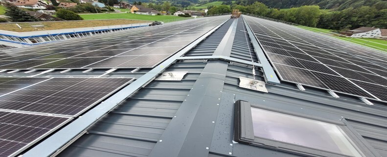 Die Module sind auf den 4 Dachflächen der beiden Produktionshallen montiert. Die Anlage ist zudem aufgrund eines Brandabschnitts mit einem Längsunterbruch montiert, damit in einem Brandfall die Ausweitung auf den anderen Hallenteil entsprechend unterbrochen ist.