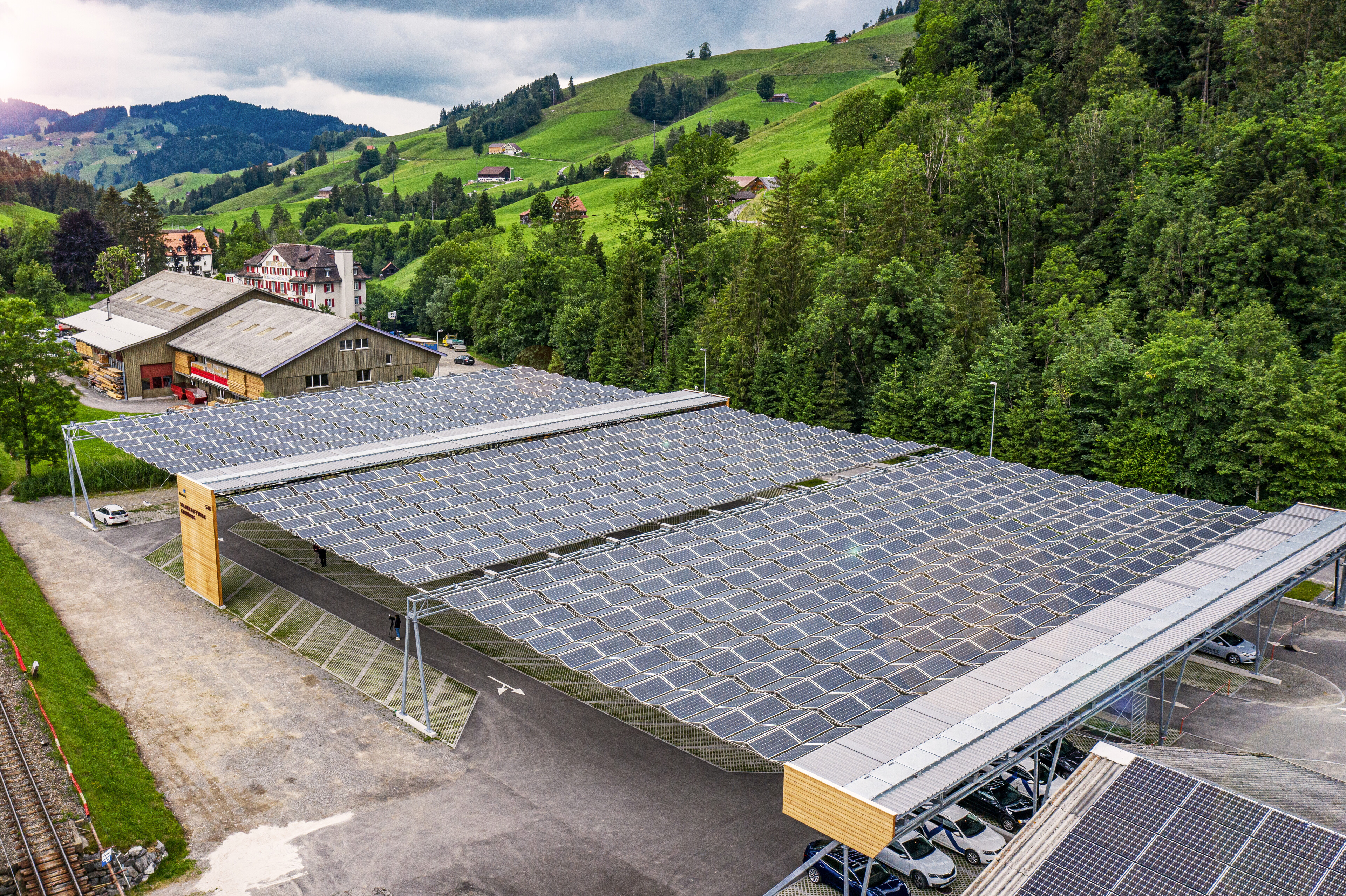 Die Photovoltaikpanels dienen gleichzeitig als Wetterschutz für das Dach. Die homogenen schwarzen Panels bieten die bestmögliche ästhetische Integration in das Landschaftsbild.